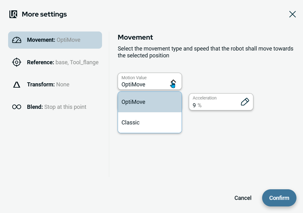 The OptiMove motion value is an advanced feature of PolyScope X Move to command. See Move To command.