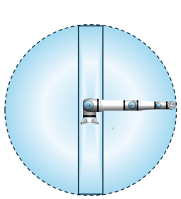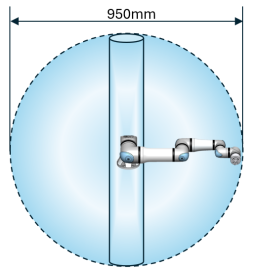 Cylindryczna bryła znajduje się zarówno bezpośrednio nad, jak i pod podstawą robota. Robot wystaje na odległość 950 mm od przegubu podstawy.