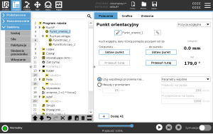Ruch między dwoma względnymi punktami orientacyjnymi jest zawsze najkrótszą drogą robota, zależnie od typu ruchu. Odległość względnych punktów orientacyjnych odnosi się do odległości kartezjańskiej między punktem TCP w dwóch pozycjach. Kąt określa, jak bardzo zmienia się orientacja punktu TCP między dwoma pozycjami, a dokładniej, długość wektora obrotu opisująca zmianę orientacji. Nie ma znaczenia, gdzie znajdowała się pozycja względnego punktu orientacyjnego wokół robota, zanim program przeszedł do względnego punktu orientacyjnego. Gdy tylko interfejs PolyScope przejdzie do względnego punktu orientacyjnego w drzewie programu, robot przemieści się z bieżącej pozycji na odległość i w kierunku zapisanym we względnym punkcie orientacyjnym. Powtarzane wykorzystanie pozycji względnych może przesunąć ramię robota poza jego przestrzeń roboczą.