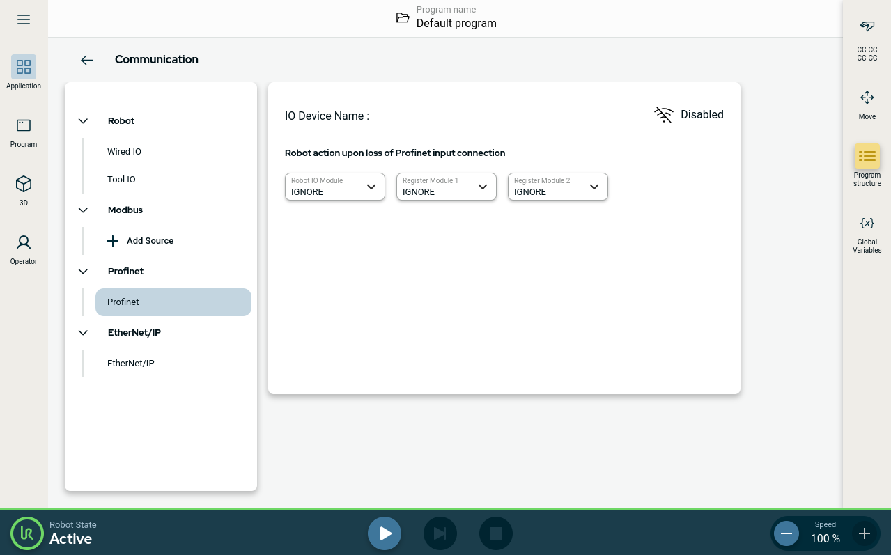 O protocolo de rede PROFINET ativa ou desativa a ligação do robô a um Controlador de E/S PROFINET industrial. Se a ligação estiver ativada, pode selecionar a ação que ocorre quando um programa perde a ligação PROFINET IO-Controller.