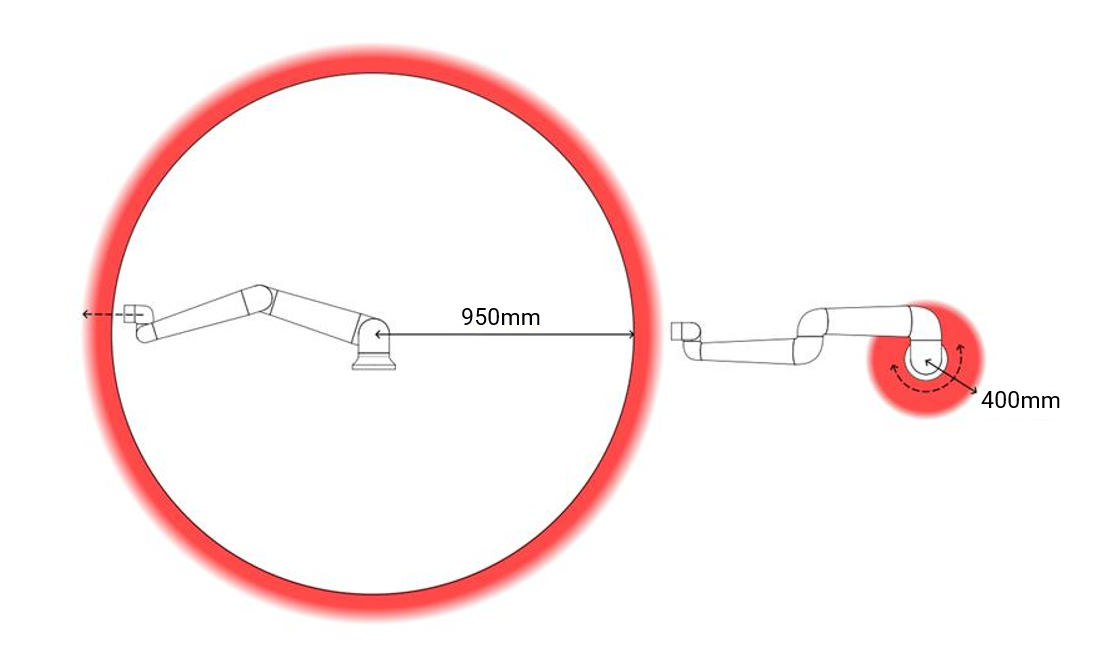 A outra área (direita) está a 400 mm da base do robô, quando se move tangencialmente.