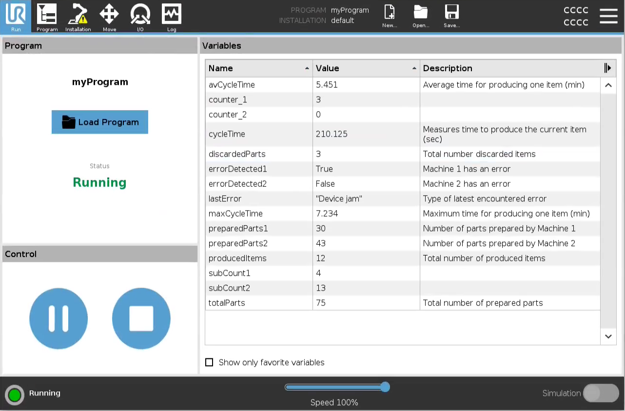 Du kan lägga till information till dina variabler genom att lägga till variabelbeskrivningar i kolumnen Beskrivning. Du kan använda variabelbeskrivningarna för att förmedla syftet med variabeln och/eller innebörden av dess värde till operatörer som använder fliken Kör-bildskärmen och/eller andra programmerare. Variabelbeskrivningar (om de används) kan vara upp till 120 tecken och visas i kolumnen Beskrivning i variabellistan på fliken Kör och fliken Variabler.