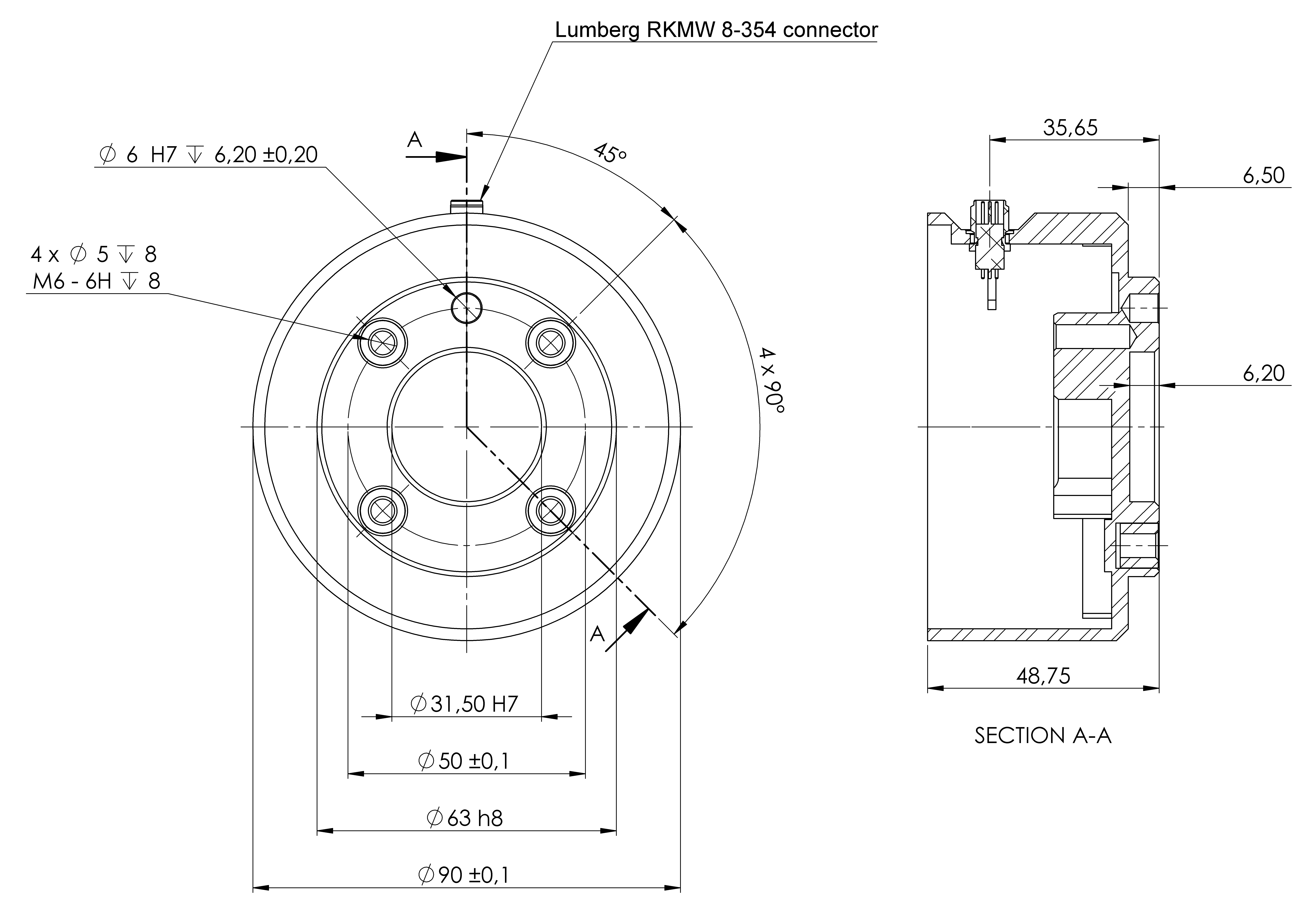 工具输出法兰 (ISO 9409-1) 是机器人端部安装工具的位置。 建议对定位销使用径向槽孔以避免过度约束,同时保持精确的位置。 |
