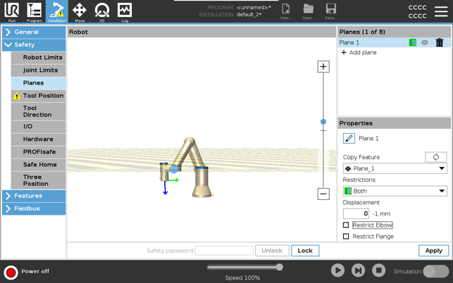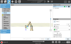 位移将沿平面法线(平面特征的 Z 轴)向正方向或负方向偏移平面。 取消选中表示“肘部”和“工具法兰”的复选框,以免它们触发安全平面。 也可根据应用的需要选中“肘部”。 不受限制的工具法兰可以穿过安全平面,即使没有定义工具也是如此。 如果未添加任何工具,“工具位置”按钮上的警告会提示您正确定义工具。 使用不受限制的工具法兰和定义的工具时,请确保工具的危险部分不会超过和/或超出特定区域。 不受限制的工具法兰可用于需要安全平面的任何应用场景,例如焊接或装配。