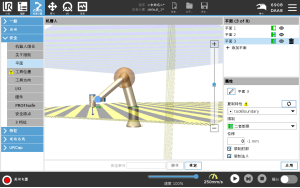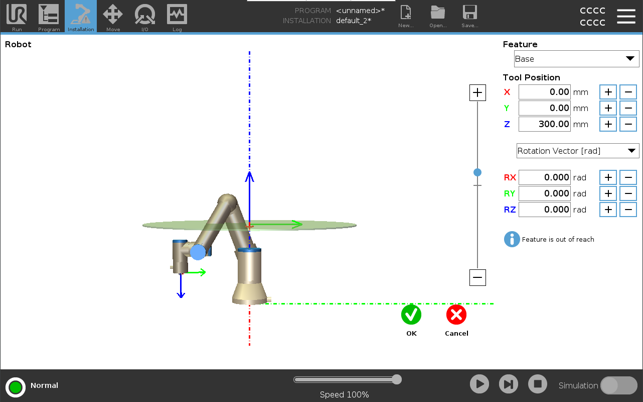 在本例中,沿正 Z 轴相对于基座特征偏移 300mm 创建了 X-Y 平面。 可以将平面的 Z 轴视为“指向”限制区域。 如果桌子表面等物体需要安全平面,可以将平面围绕 X 轴或 Y 轴旋转 3.142 弧度或 180°,以便限制区域位于桌子下方。 (提示:将旋转显示从“旋转矢量 [rad]”更改为“RPY [°]”) 如果需要,可以稍后在安全设置中向正或负 Z 方向上偏移平面。 当对平面的位置感到满意时,点按“确定”。