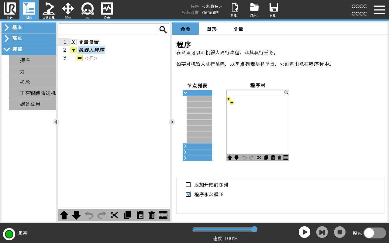 在“程序”选项卡中,可以创建和编辑机器人程序. 有两个主要区域: