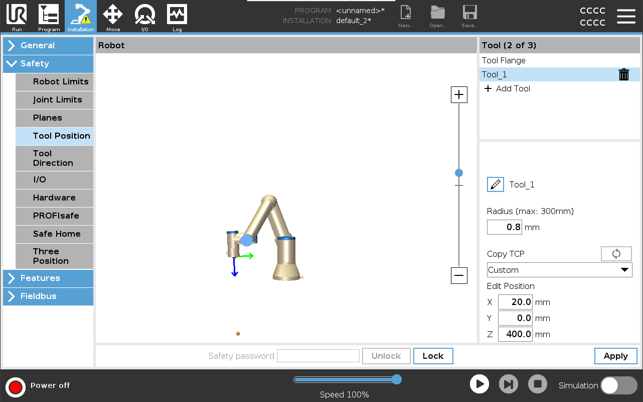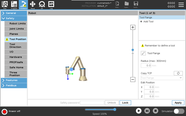 您必须在安全设置中设置工具位置,以便在工具 TCP 接近安全平面时正确触发安全平面。 如果出现以下情况,“工具位置”上会一直显示警告: