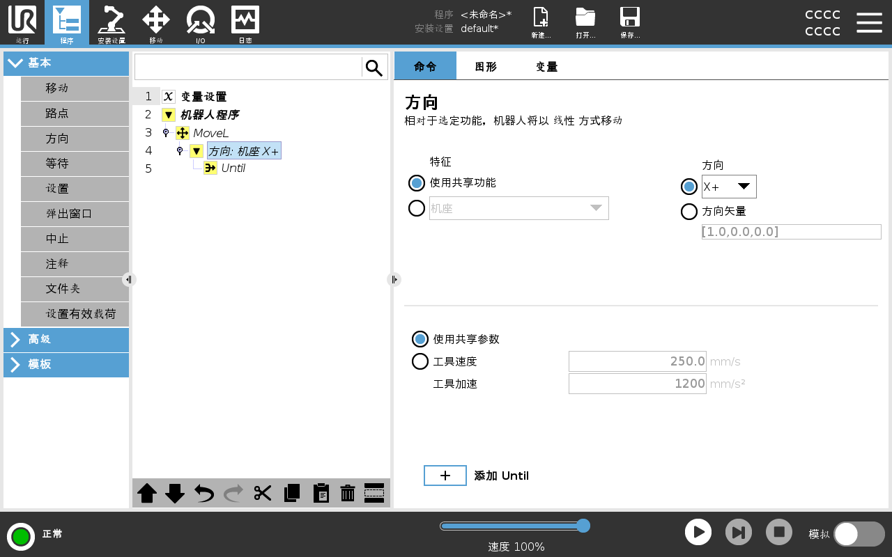 方向矢量 [100,0,0] 和 [1,0,0] 对机器人的作用相同;使用速度滑块以所需速度沿 x 轴移动。 方向矢量中的数字值仅相对于彼此。 |
