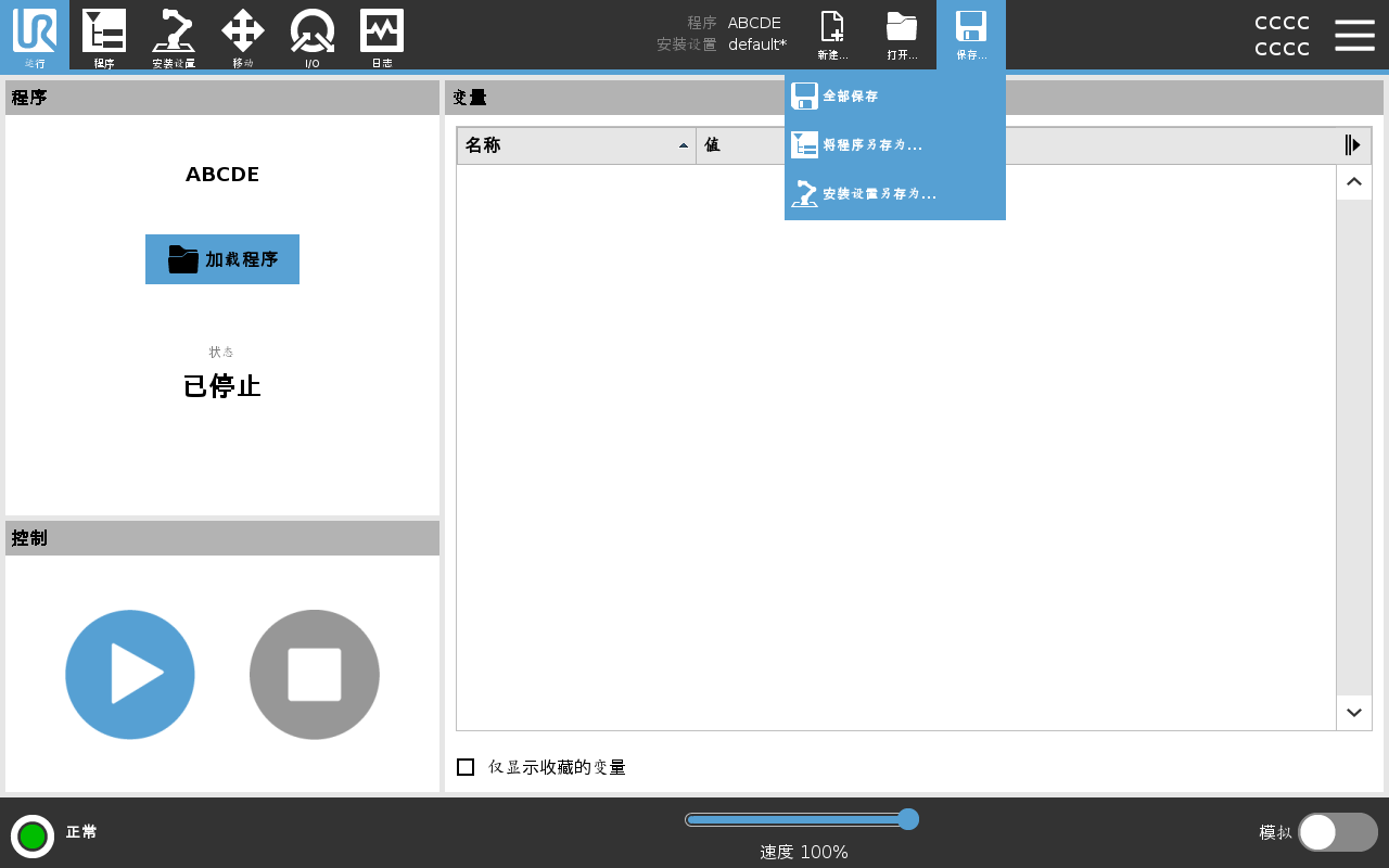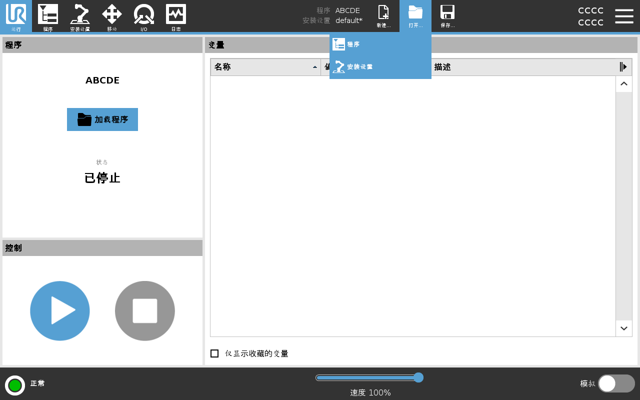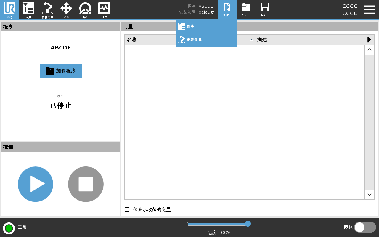 程序和安装设置管理器是指三个图标,允许您创建、加载和配置程序和安装设置: 您可以为机器人提供多个安装文件。 创建的程序自动加载并使用活动安装。