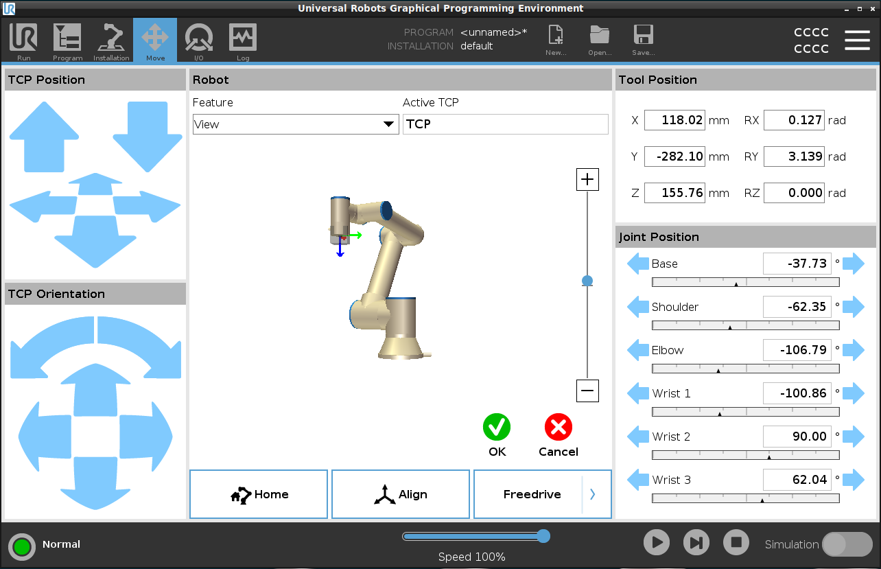 您可以使用自由驱动模式,也可以使用“移动”选项卡中的手动控件移动机械臂。 请参阅:移动