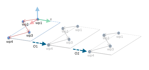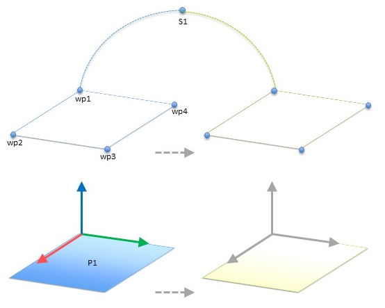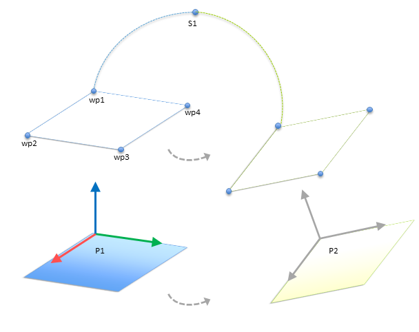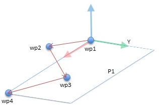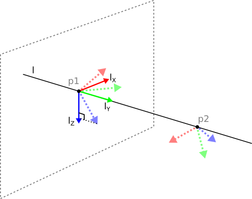 在图中,您可以看到从第一个点指向第二个点的轴,构成了直线坐标系的 y 轴。 z 轴由 p1 的 z 轴在垂直于直线的平面上的投影定义。 直线坐标系的位置与 p1 的位置相同。