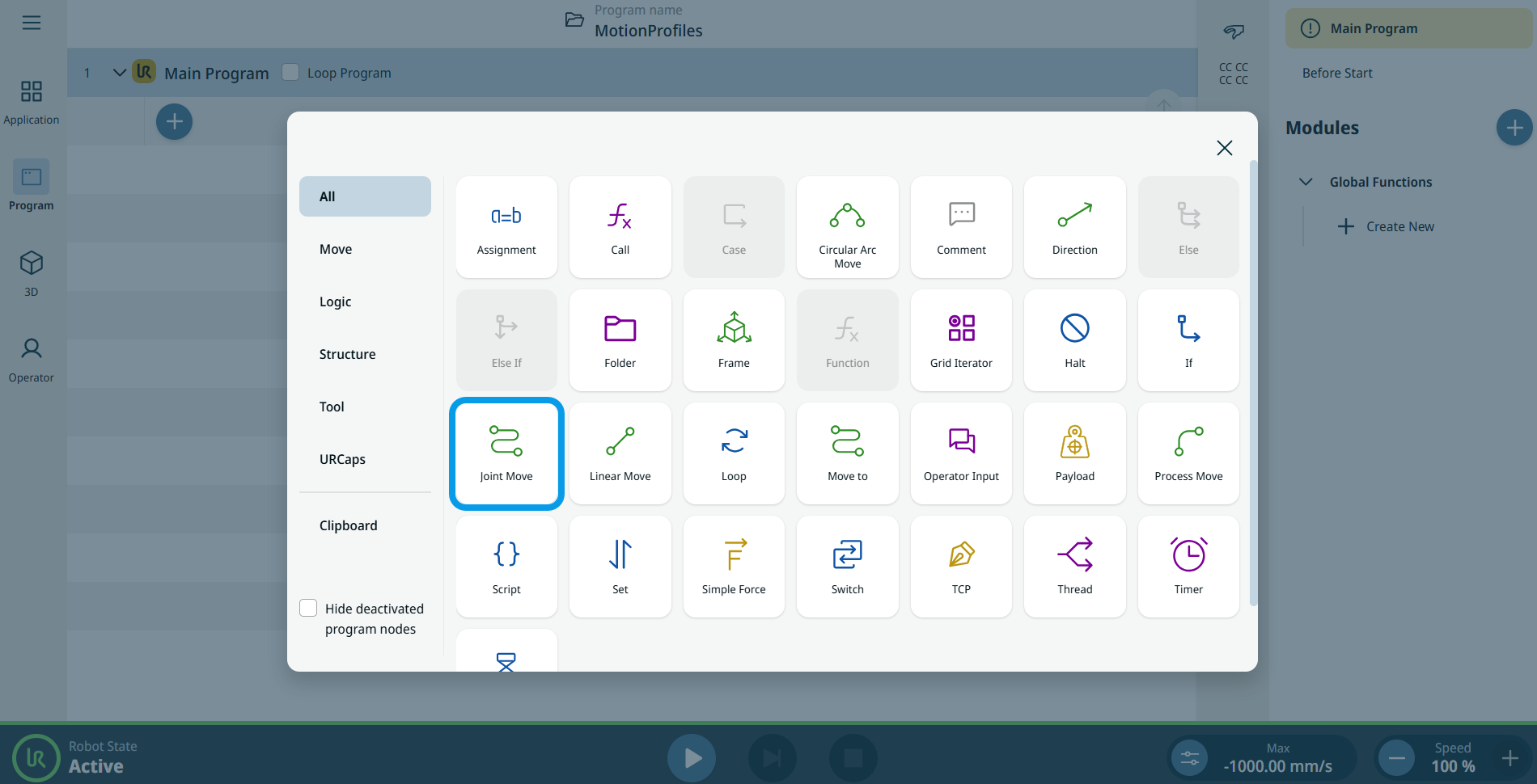 The Joint Move works in a similar way to Move to command, but it supports Motion Profiles. The command creates a movement from point A to point B that is optimal for the robot. 該移動路徑可能不是 A 和 B 之間的直線,但是對關節的開始位置和關節的結束位置而言是最佳的。 Joint Move makes movements that are calculated in the robot arm joint space. 控制關節同時完成其移動。 此移動類型將為工具沿著一個曲線路徑前進。