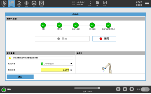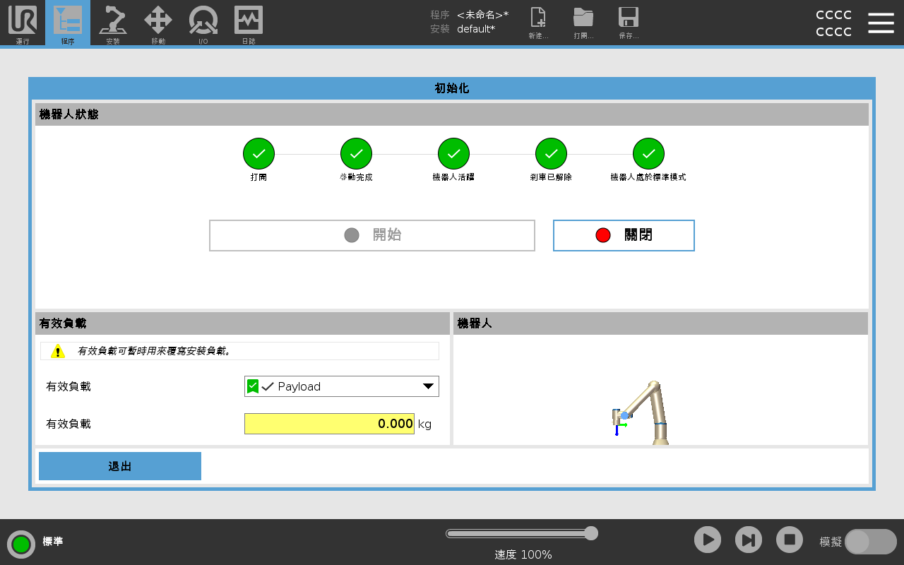 啟動機器人手臂會解除剎車系統,讓您開始移動機器人手臂並開始使用 PolyScope。 「初始化」框中的圓圈會變色,您可以追蹤進度。 頁腳中的「初始化」按鈕也會隨機器人手臂的狀態而改變顏色。