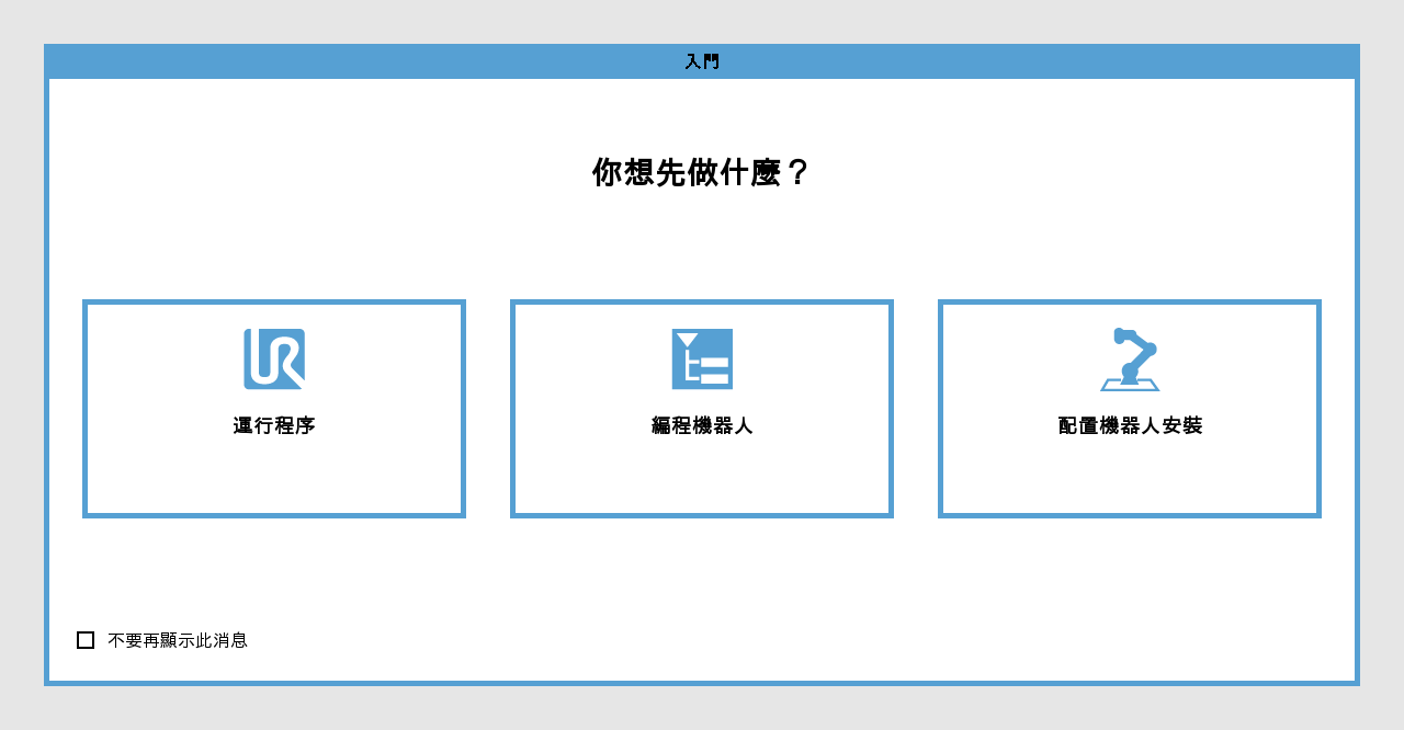 在初次啟動時,您可能需要驗證機器人手臂的安裝方式。 如果機器人手臂安裝在平穩的檯面或地面上,無需進行任何變更。 如果未驗證機器人手臂的安裝,則會出現「入門」對話方塊。