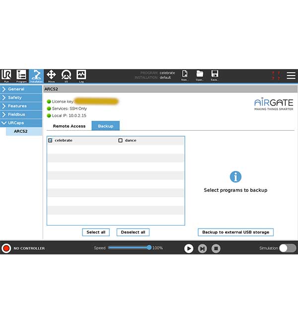 AIRGATE is proud to present the new ARCS2 remote access solution making it even easier to get in touch with Universal Robots – get access to any robot via VNC to troubleshoot, program and control your robots or your customers robot, and get E-mail notifications if robots stops unexpectedly. Access to UR operation system (SSH) and the possibility to backup of UR programs to USB stick are included. ARCS2 is a plug and play software-only solution with a very user friendly URCap for CB-series and E-series. ARCS2 is a very secure (LAN) communication solution, which reduce overall production costs, improved quality, minimized production downtime and increase operational efficiency.