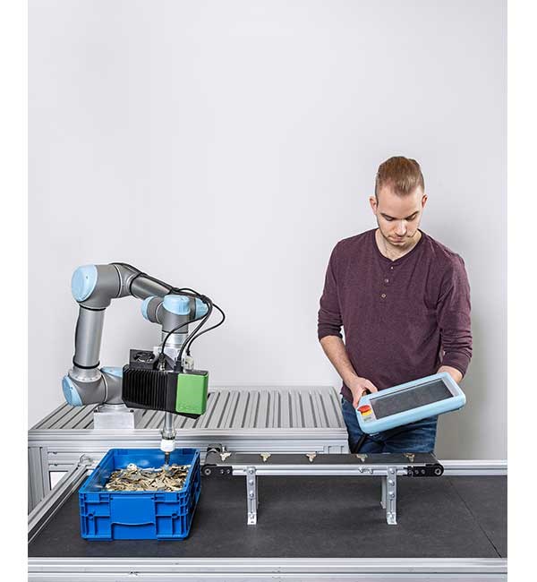 The Pickit package contains a 3D camera and the 3D Picking software ready-to-run on a dedicated industrial processor. To configure an application with Pickit you don’t need to write a single line of code. From your Universal Robots' teach pendant, you can ask Pickit to locate the products you want to pick. The Pickit 3D camera captures 3D images which are processed at high speed on the Pickit industrial processor to detect their positions. These positions are sent back to the robot for picking.How does